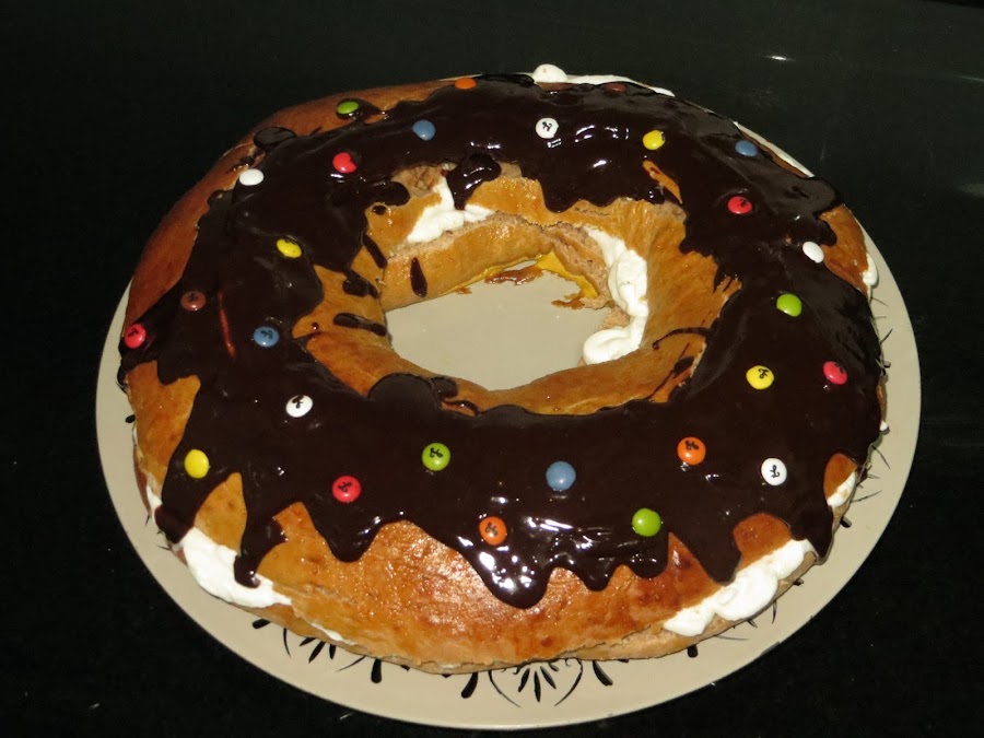 En un cazo echamos el chocolate para fundir con la nata (crema de leche) y cuando lo tengamos totalmente fundido lo retiramos y se lo echamos al roscón por encima, así sí tiene alguna imperfección la podéis tapar. Si tenéis peques en casa lo podéis decorar con chuches como con unos Lacasitos.