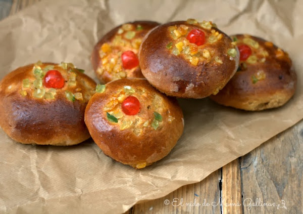 Pintar con huevo batido y adornar con frutas escarchadas y azúcar humedecido con unas gotas de agua.