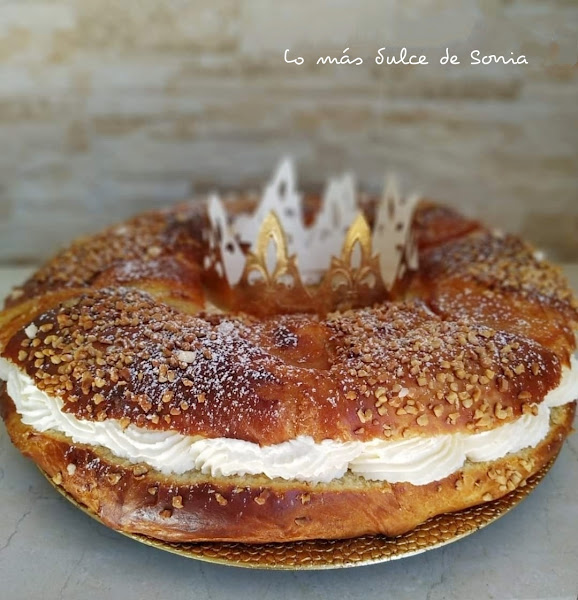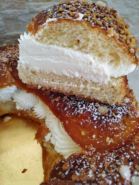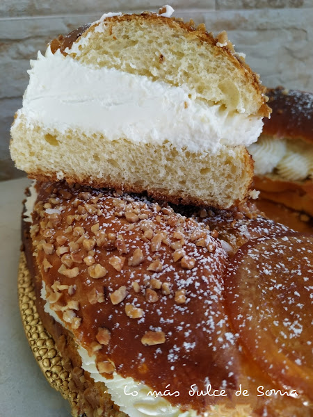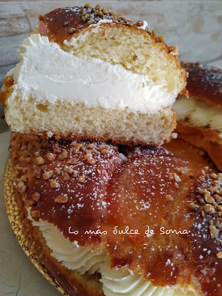Cuando el roscón esté totalmente frío, corta longitudinalmente con un cuchillo de sierra, pon en el centro la nata montada (crema de leche) y cubre con la mitad superior. También puedes rellenarlo de trufa, crema o lo que más te guste.