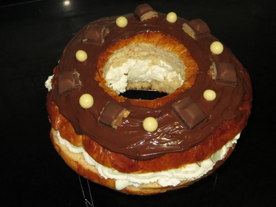 Una vez habéis sacado el roscón dejáis que se enfríe y lo partís por la mitad lo rellenáis con la nata (crema de leche) y los huevos kínder. Derretís el kínder chocolate y se lo echáis por encima y lo decoráis con kínder bueno, happy hipo o choco bons. Yo sólo utilice el primero porque no encontré de los otros dos y metí unas bolas de chocolate blanco para darle más colorido.
