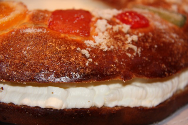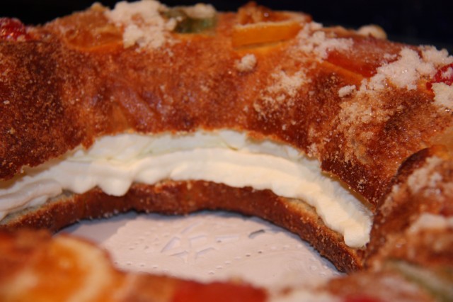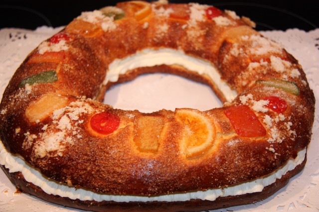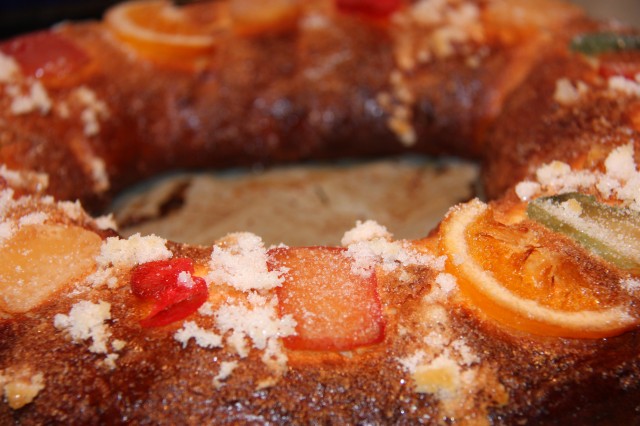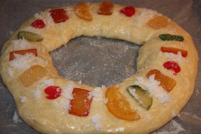 Pintamos con huevo batido y decoramos al gusto, si es roscón con frutas escarchadas y azúcar. Podemos también decorarlo sólo con azúcar humedecida.