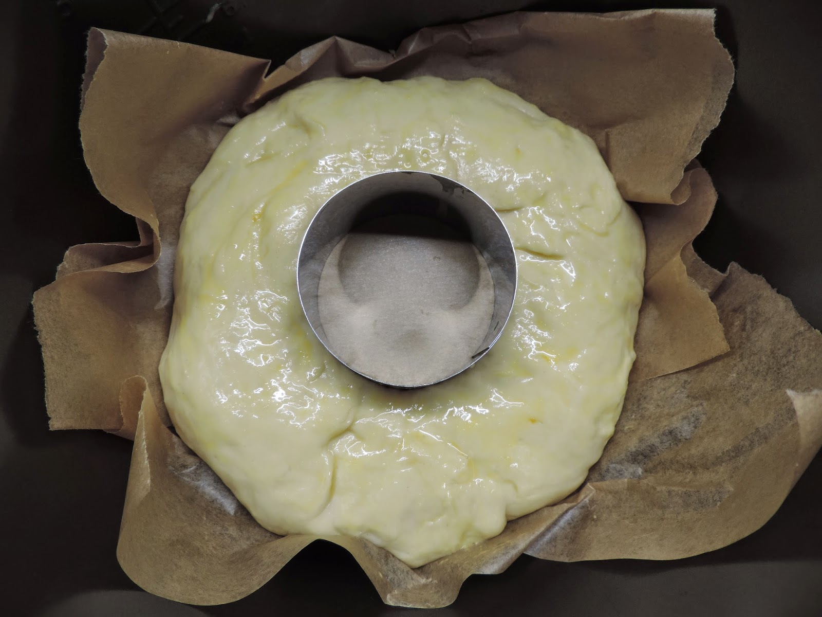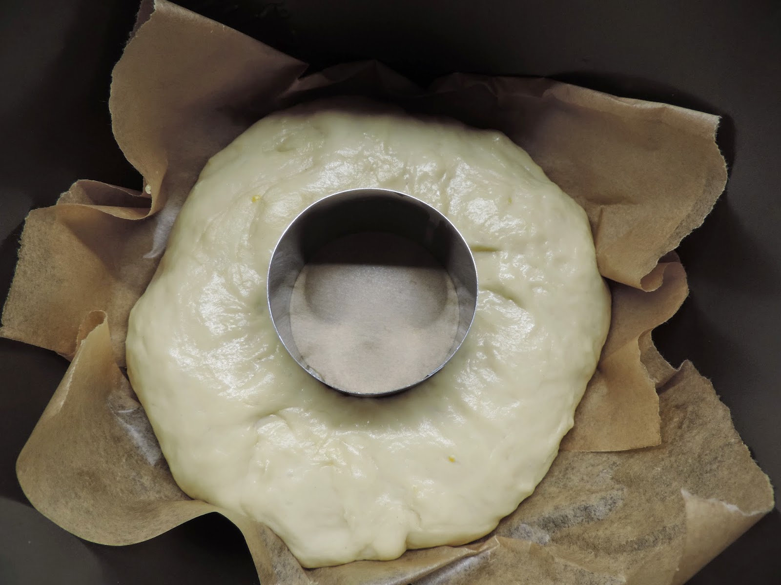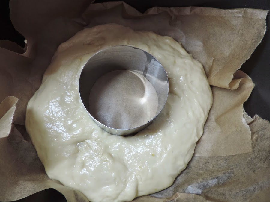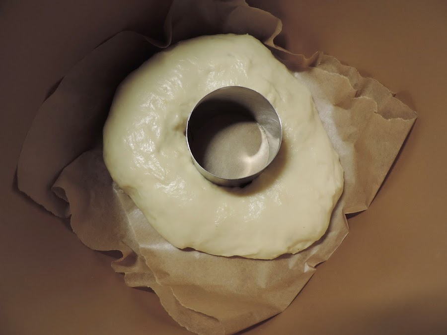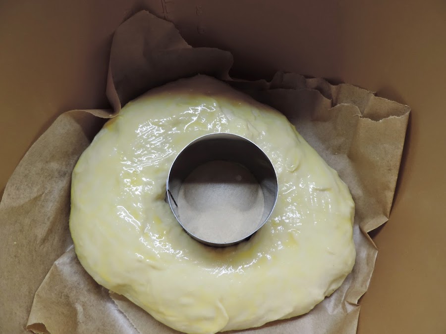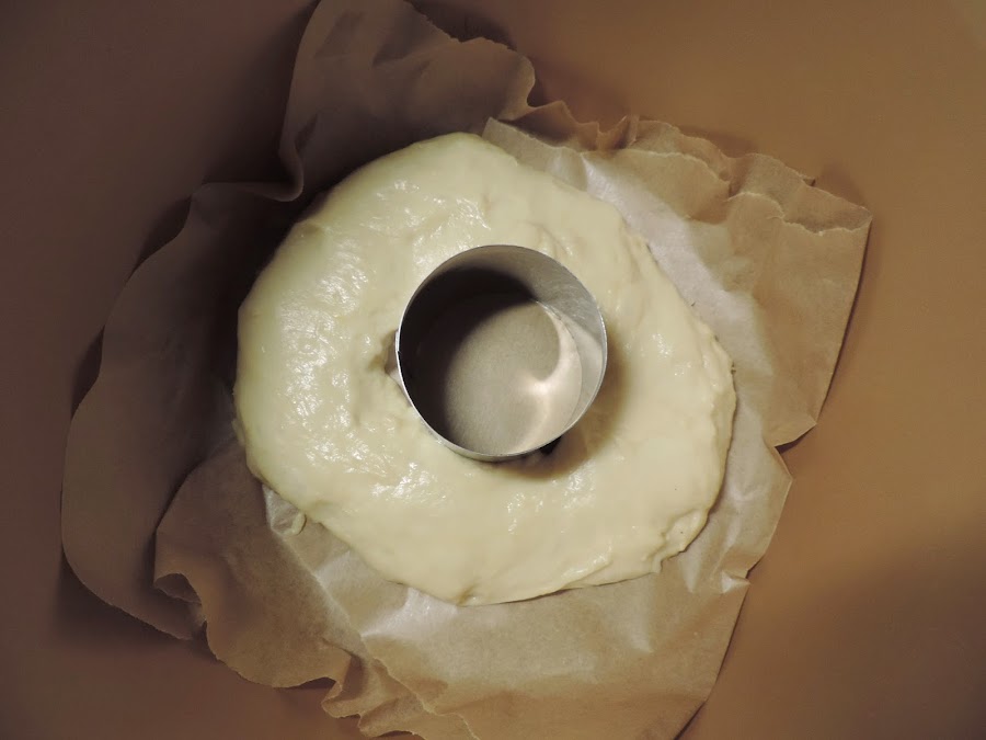 Le damos la forma, le ponemos un aro de emplatar dentro para que no se cierre en centro y la metemos dentro de la cubeta de la olla para dejarla reposar otra vez hasta que doble el volumen.