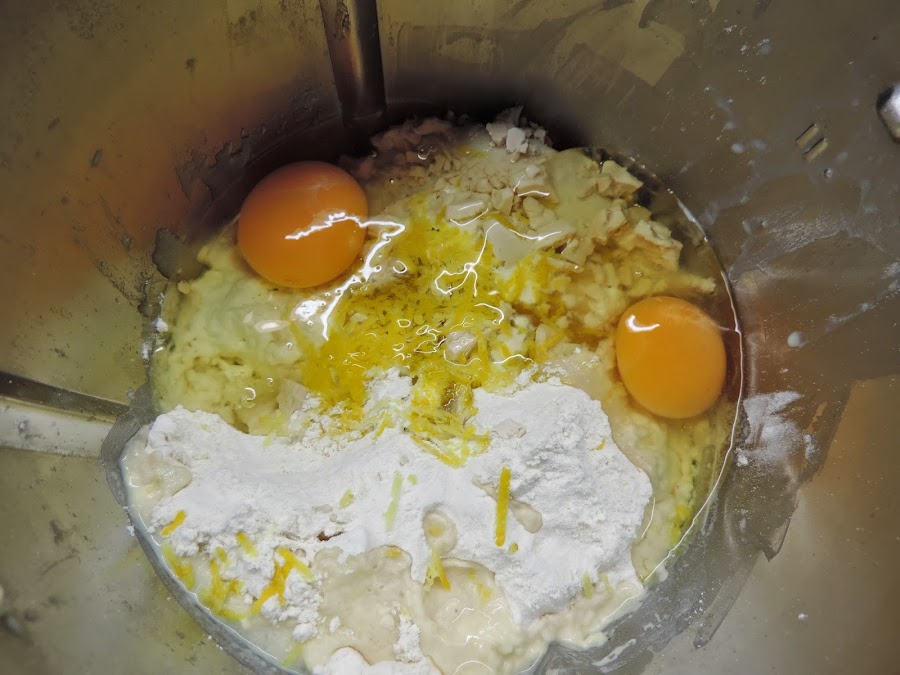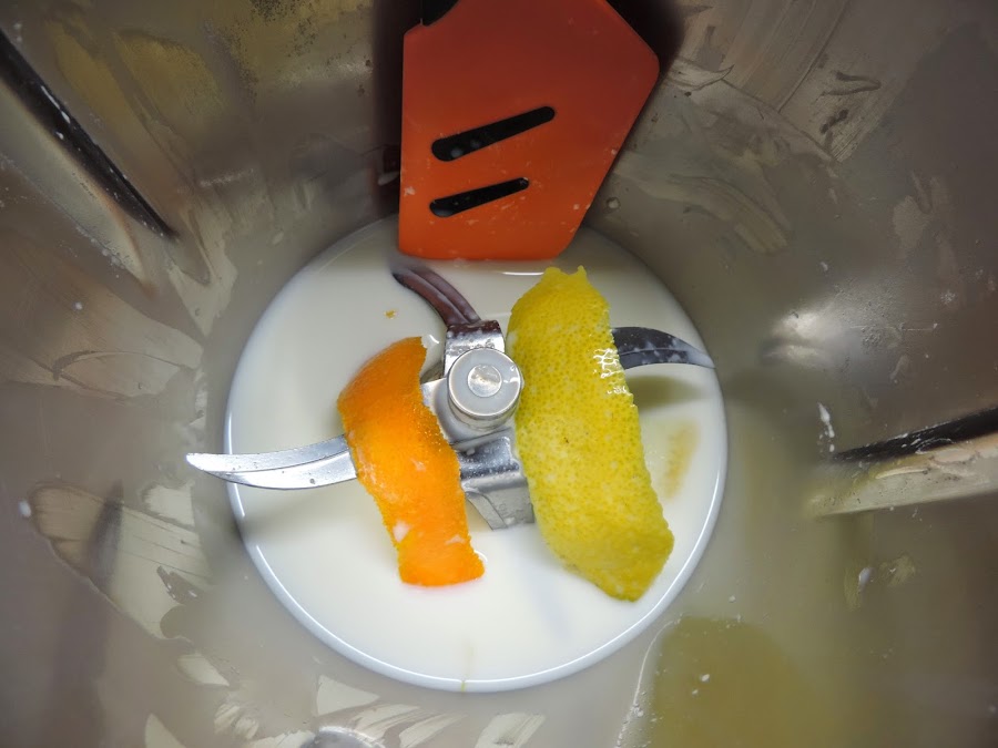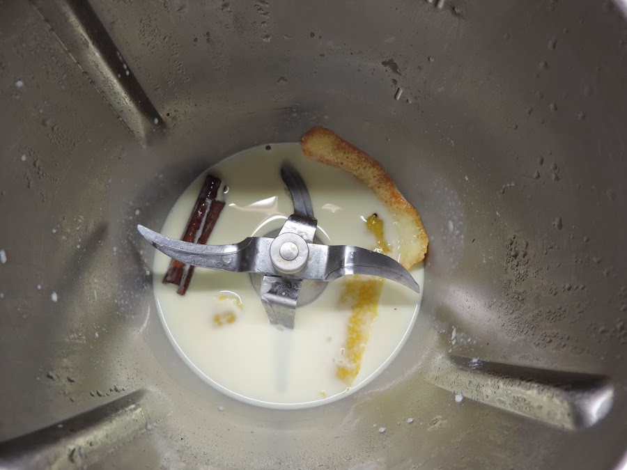 Poniendo los 60 grs. de leche para hacer la masa, en el vaso del thermomix, con una rama de canela y un trozo de corteza de la piel de limón y naranja.