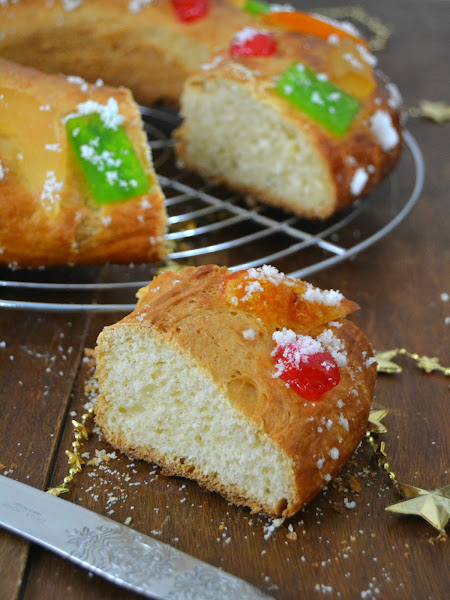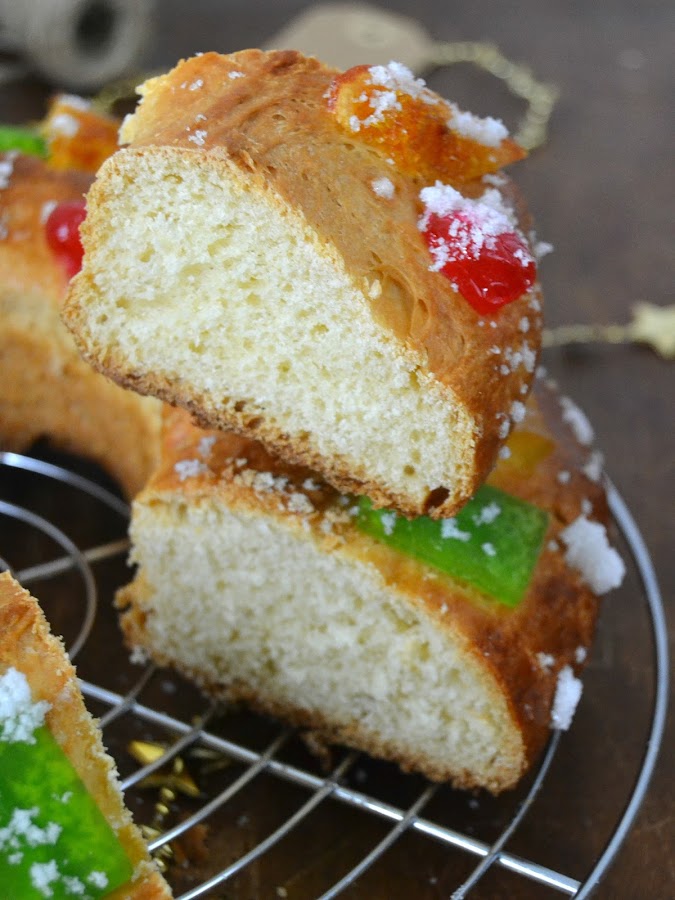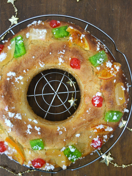 11.- Una vez fermentado el roscón lo pintamos de nuevo con clara batida. Repartimos la fruta confitada y el azúcar mojado sobre el roscón.
