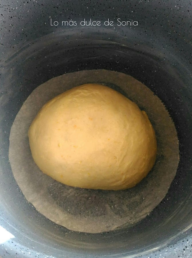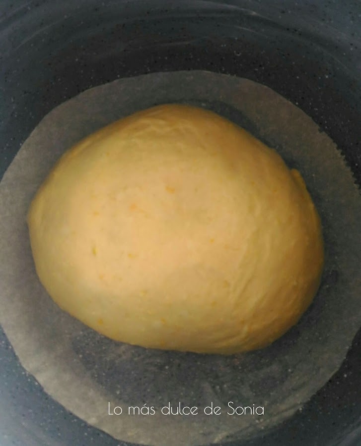 Una vez hecha la masa con la elaboración elegida, engrasamos bien la cubeta con mantequilla, ponemos papel vegetal en la base, colocamos la bola de masa, ponemos la tapa y elegimos el programa fermentar, 1 hora.