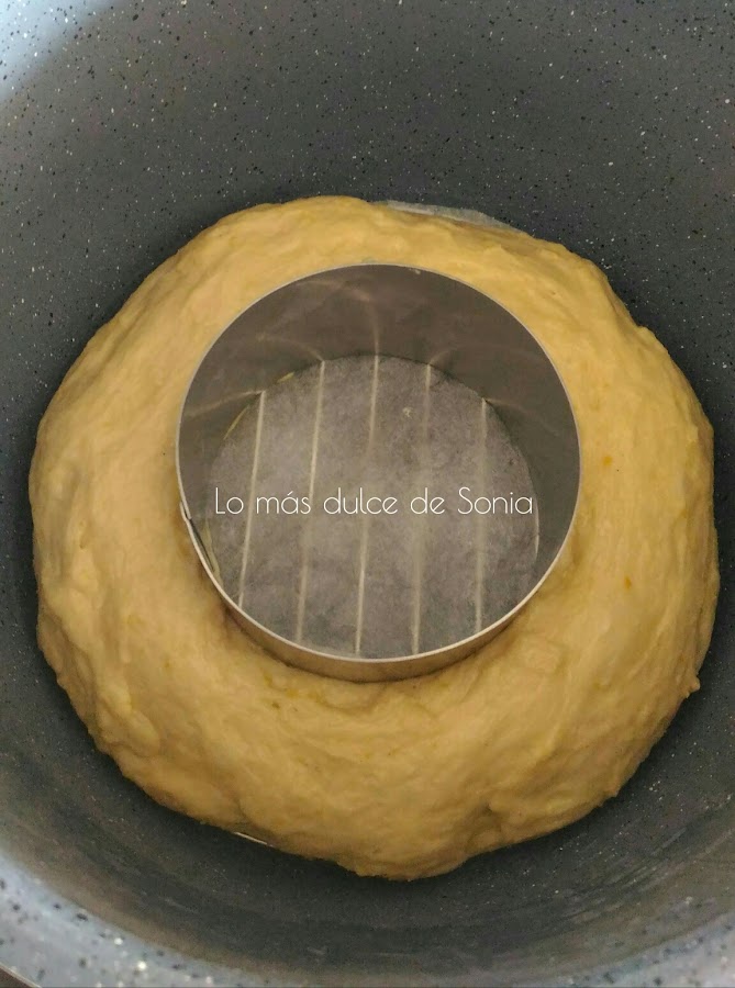 Cuando doble el volumen, pasamos la masa a la superficie enharinada, nos engrasamos las manos. Dejamos reposar 5 minutos y hacemos un agujero, introduciéndolos dedos y haciéndolo grande poco a poco, con cuidado. Podéis poner un aro de emplatar bien engrasado en el centro.