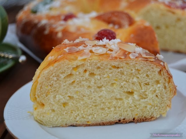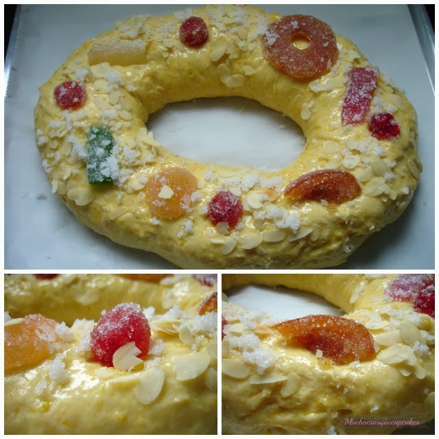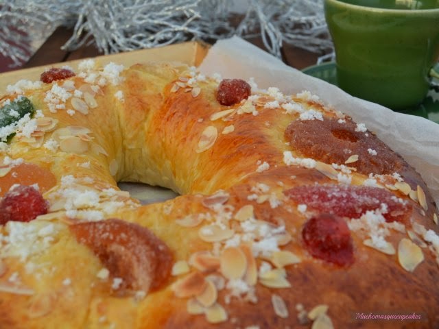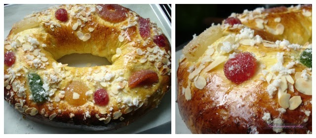 Ya para terminar, os digo que podéis hacer el roscón hasta que lo decoráis con la fruta, etc... y meterlo en la nevera hasta el día siguiente y así el día 6 cuando os levantéis solo hay que meterlo en el horno. Lo sacáis de la nevera mientras se precalienta el horno para que no esté tan dormida la masa y lo horneáis como os he contado. Así lo tenemos recién hecho el día 6.