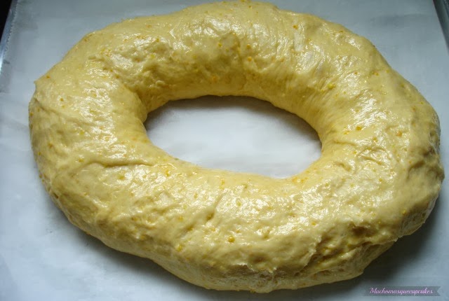 Ponemos el roscón en una bandeja de horno y pintamos bien con huevo batido (sin dejaros rinconcitos sin pintar, que luego se nota). Ahora es el momento de poner el rey y el haba por la parte de abajo del roscón. Dejamos dentro del horno (apagado) para una segunda fermentación. Una hora y media o dos horas (en mi caso dos por el fresco que hace).
