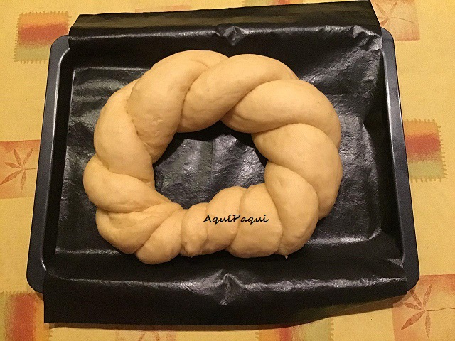 Tras el primer levado, con la masa hacemos dos tiras, formamos un cordón y lo convertimos en una rosca.