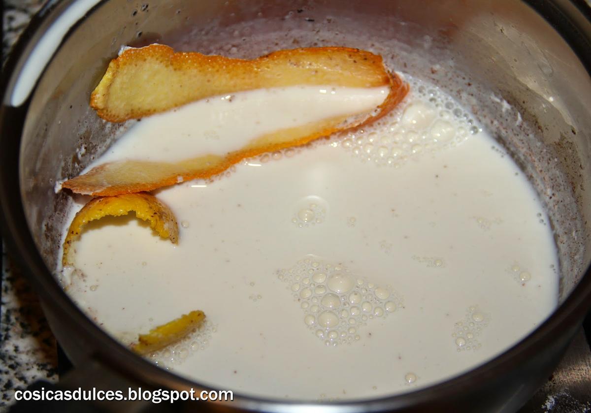 Para la infusión de leche hervimos la leche con la canela, la piel de limón y naranja. Dejamos que hierva unos cinco minutos y después, lo ideal es dejarlo en la nevera toda una noche para que se infusione. Al día siguiente le añadimos el agua de azahar y el ron y lo colamos. Debemos tener 120 gramos. si pesa menos le añadimos agua hasta completar el peso.