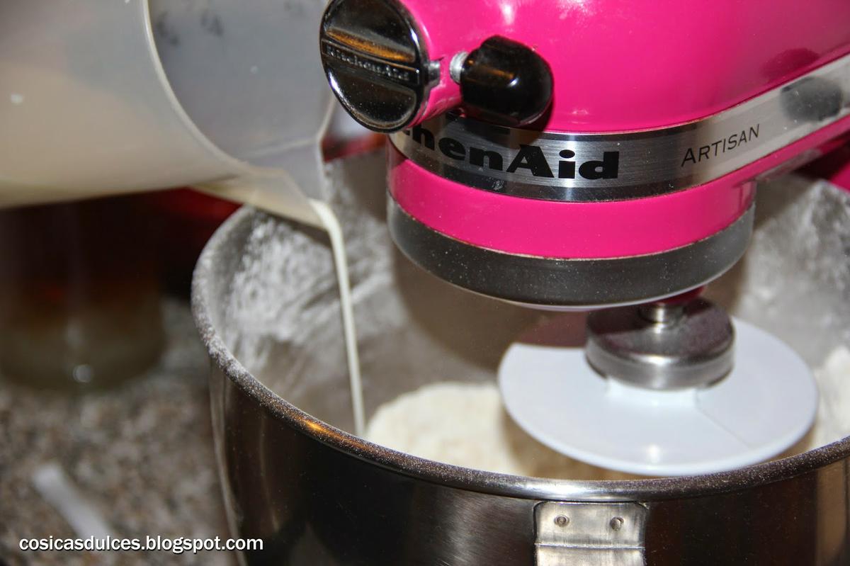 Vamos añadiendo la infusión de leche en forma de hilo mientras amasamos (si lo hacemos en la Kitchenaid con el accesorio de gancho y velocidad 5). Una vez que esté todo bien integrado dejamos reposar la masa 10 minutos.