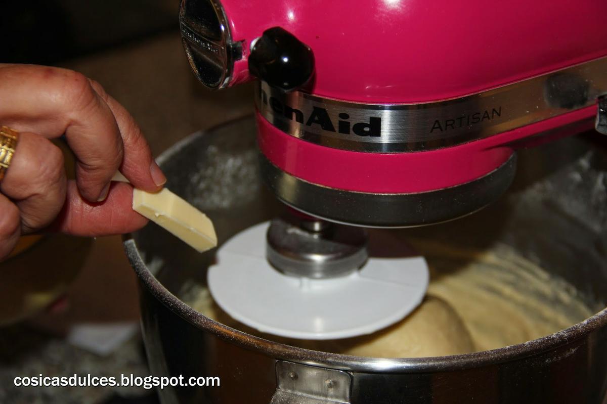 Volvemos a amasar durante 5 minutos y es entonces cuando vamos añadiendo la mantequilla cortada a daditos (si lo hacemos en la kitchenaid a velocidad 8). Volvemos a dejar reposar la masa 10 minutos.