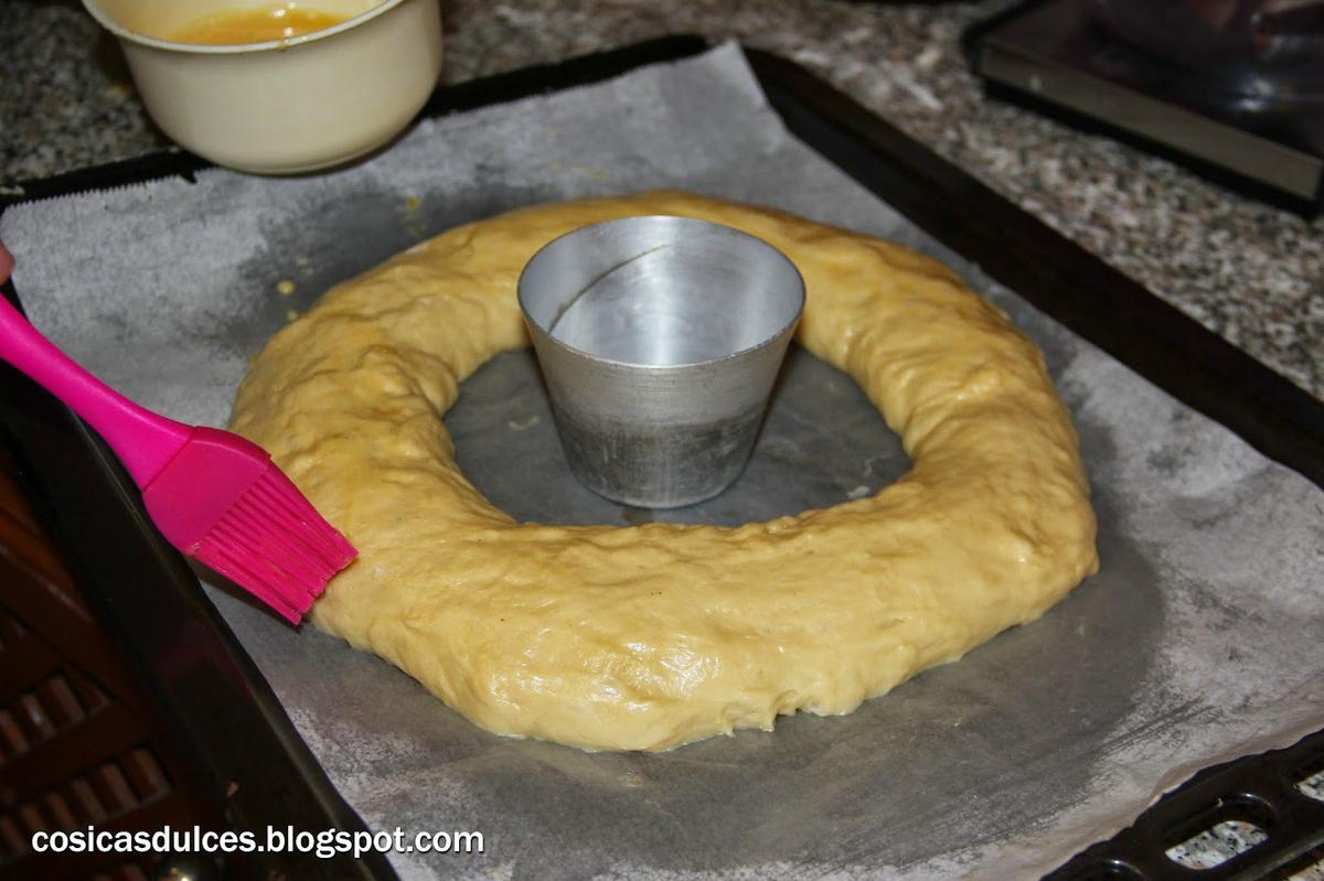 Cuando la masa haya doblado su volumen la ponemos en la mesa de trabajo y la apretamos con las manos para desgasificarla. Hacemos una bola y la volvemos a dejar reposar 15 minutos. Entonces procedemos a darle forma. Para ello clavamos un par de dedos en el centro de la bola de masa y los vamos haciendo girar para que se vaya agrandando. Pincelamos el roscón con huevo y volvemos a dejarla reposar hasta que doble su volumen.