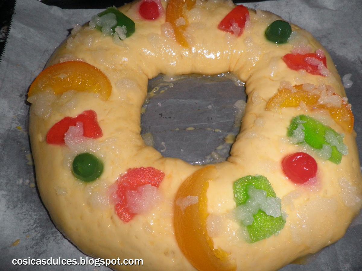 Una vez que el roscón haya doblado su volumen lo volvemos a pincelar de huevo y lo decoramos con la fruta escarchada y el azúcar humedecido.
