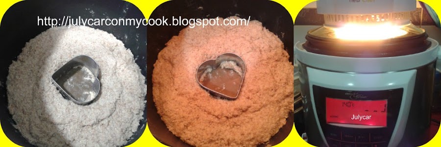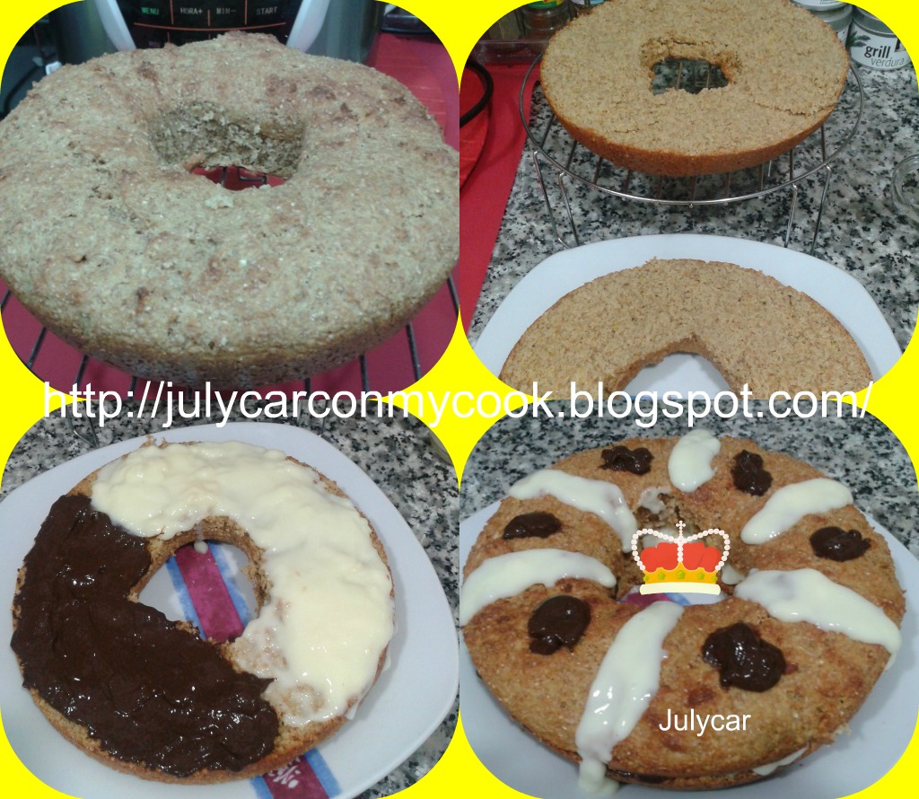 Poner todos los ingredientes en el mismo orden de la receta en la panificadora, programa nº 6, amasado con levado, cuando este en el 2 amasado, sacar la masa ( no es demasiado conpacta pero mas o menos se maneja) poner la base de silicona en la cubeta de la cocimix deluxe y añadir la masa (yo a pegotes y los he ido uniendo) aplastar y unir bien, hacer un agujero en el centro y poner un molde para que no se cierre el agujero (puede ser un aro de acero, un vaso, etc...) tapar con la tapa horno ó programable y dejar reposar 30 minutos, ahora programar la olla menú horno 140º, 30 minutos, la tapa horno ó doradora 130º, 20 minutos (trabajan juntas al mismo tiempo), cuando termine sacar y dejar enfriar, cuando este frio partir por la mitad y rellenar de lo que mas os guste (yo la mitad de crema de pudingg y dip de chocolate) cerrar y adornar (yo con crema de pudingg y dip de chocolate)