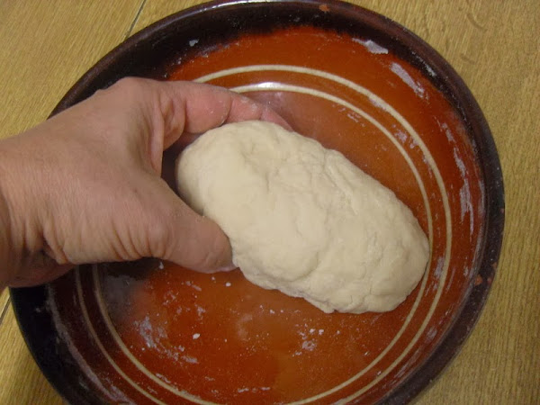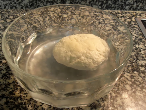 Poner la bola de masa madre en un bol cubierta con agua algo tibia, dejarla reposar 10 o 15 minutos hasta que flote.