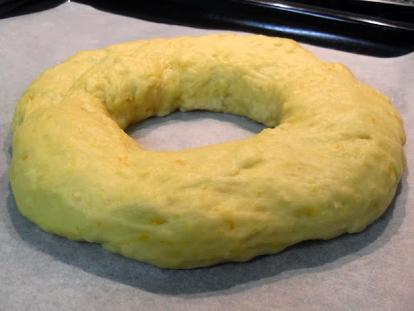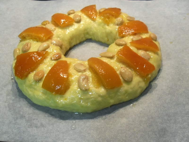 2ª parte de horno: Precalentar el horno a 50º , y poner el roscón en el horno apagado durante 1 o 2 horas para su fermentación y duplicar su volumen.