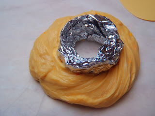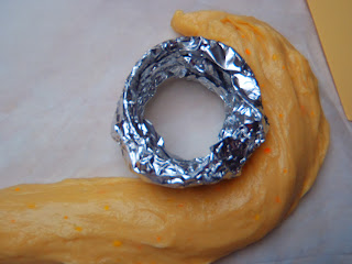 Pegamos a cada barra un aro, o algún molde de forma circular (pueden valernos los moldes metálicos para magdalenas que venden en el chino. Yo he usado un cortador de galletas redondo, bien forrado de papel de plata), y enrollamos la barra a su alrededor.