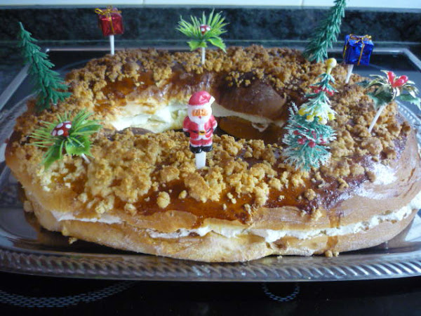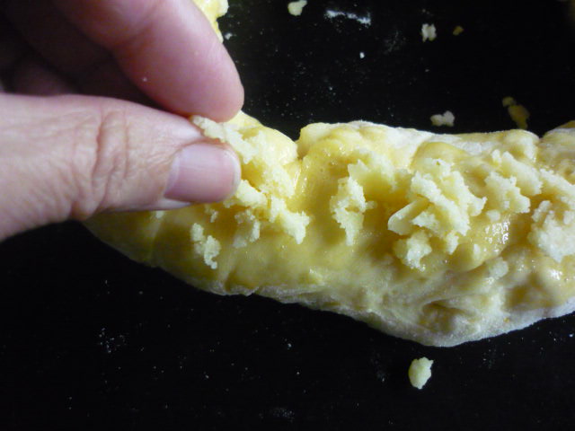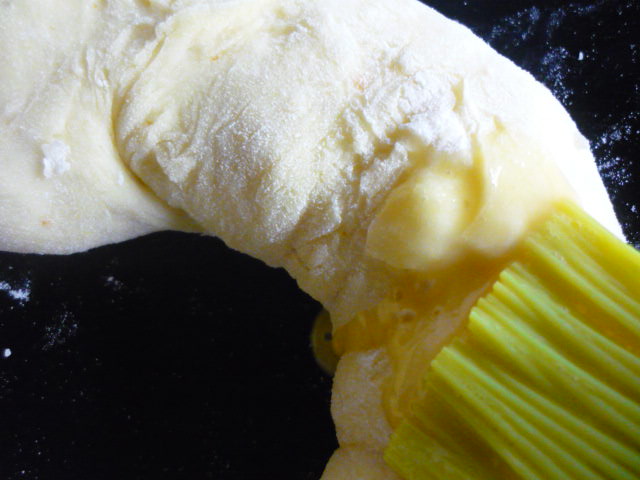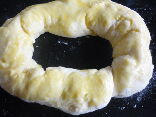 11.- Pincelamos con huevo batido y extendemos el adorno por la superficie.