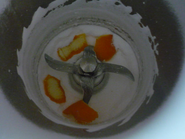 2.- Añadir la piel del limón y naranja. Pulverizar 15 seg. velocidad progresiva 5-10.