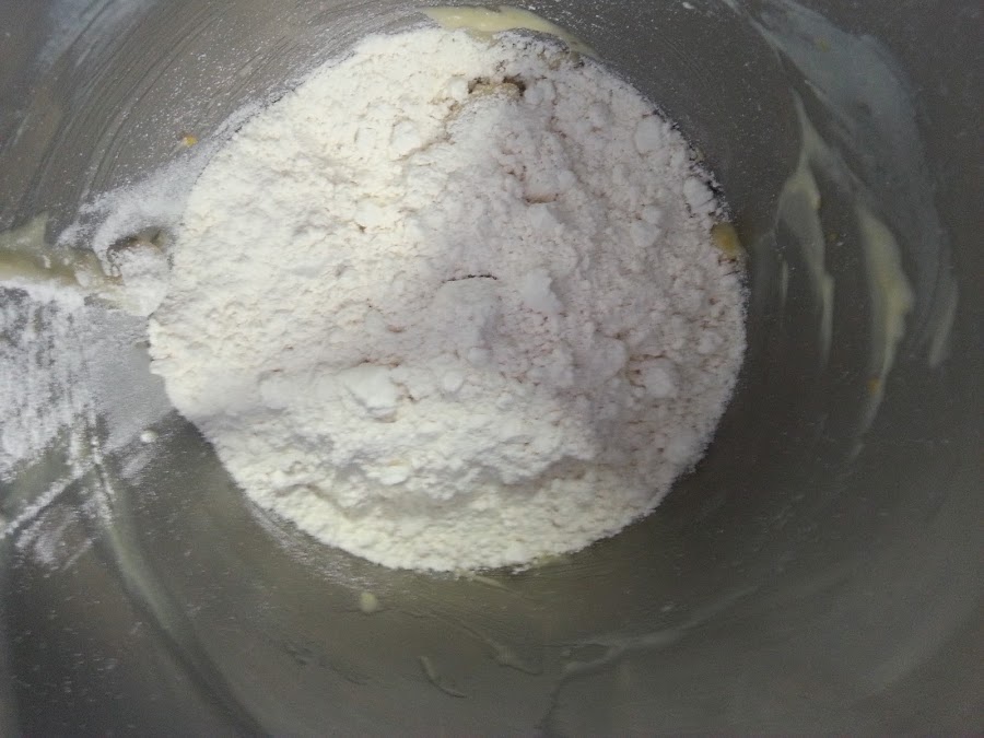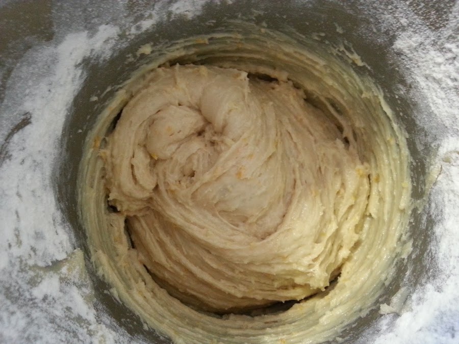 5. - Por último le añadimos la mitad de la harina, amasamos y le agregamos el resto de harina hasta conseguir una masa consistente, cuanto más amasemos, mejor quedará.