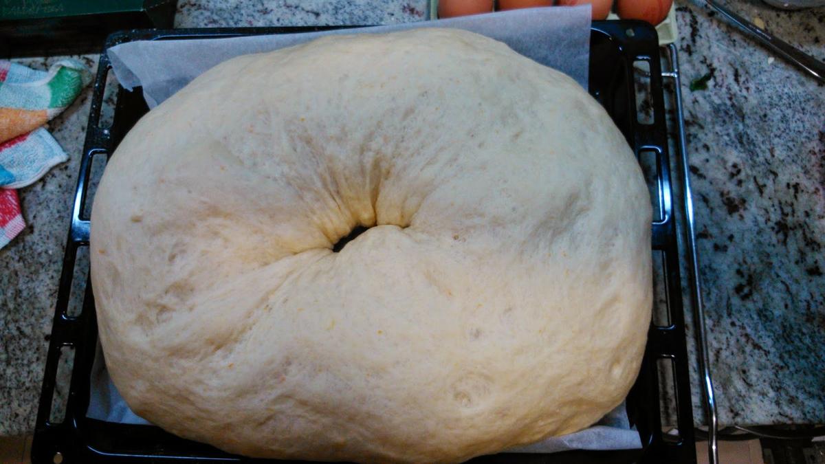 El agujero se hará más pequeño al hornearlo, así que es conveniente hacerlo grande. Lo dejamos reposar una hora más bien cubierto en lugar caliente; yo precaliento el horno a 50º y luego lo apago, entonces meto allí el roscón durante otra hora y además se mantendrá caliente (Tercera fermentación)