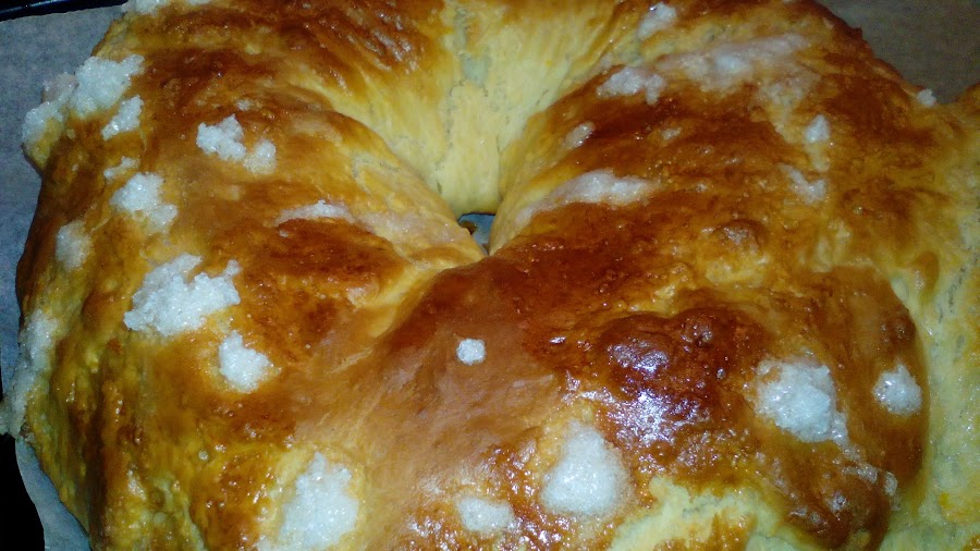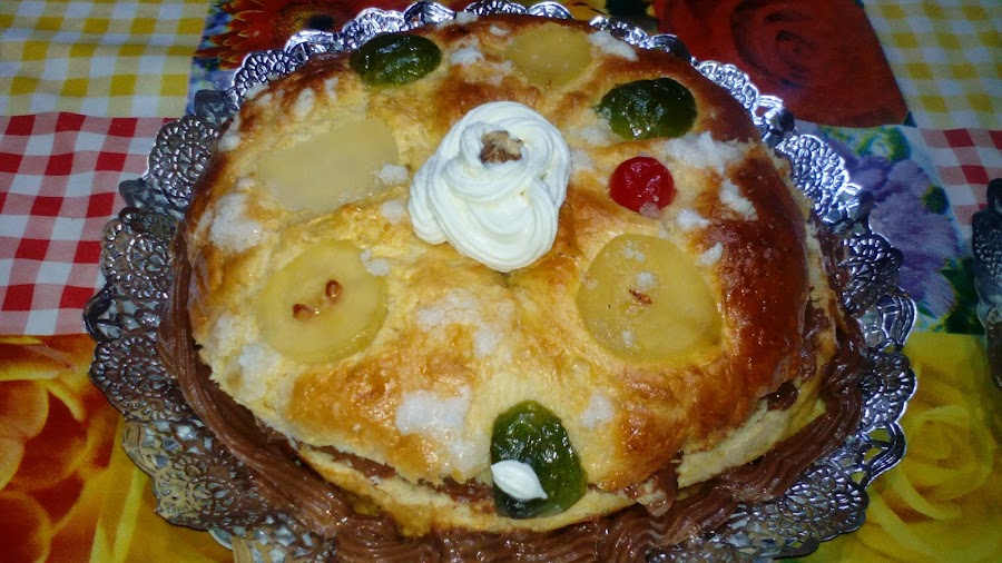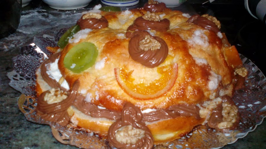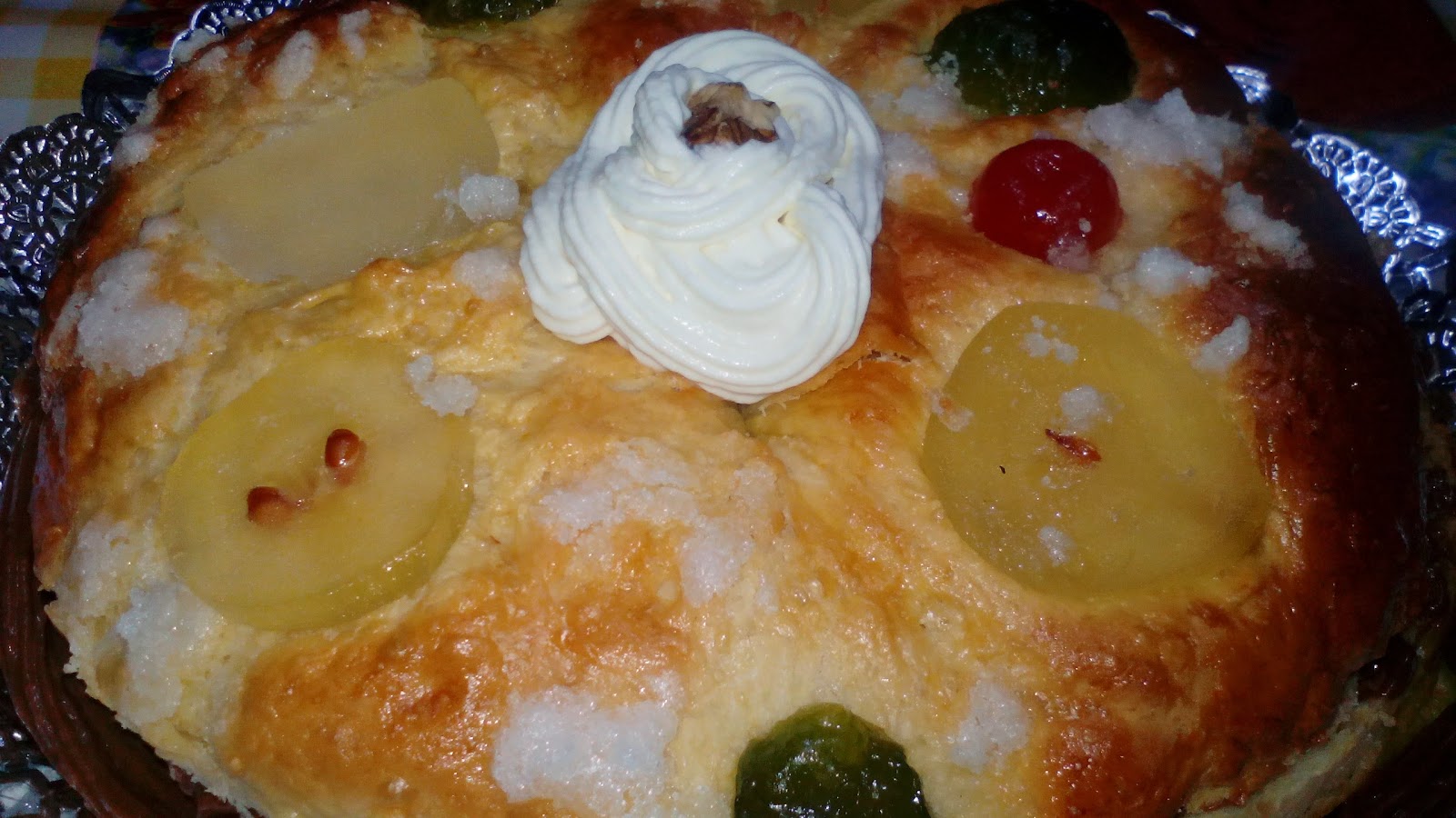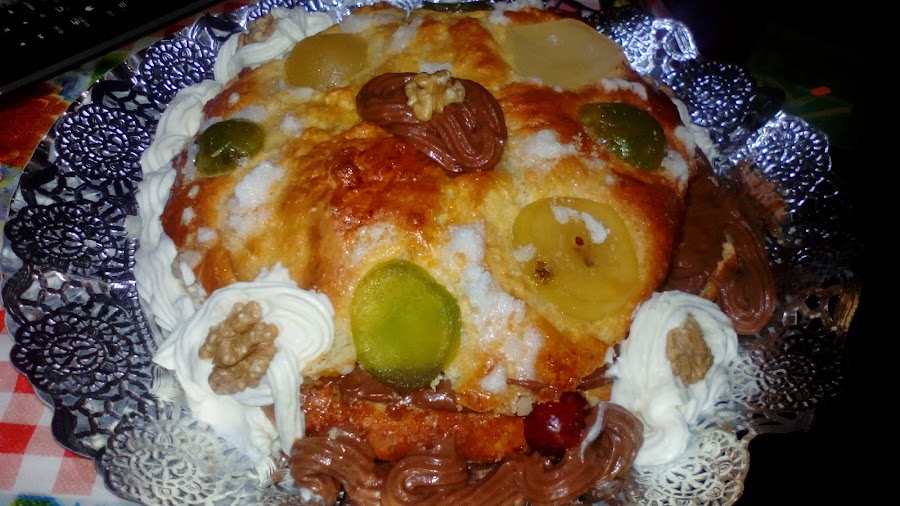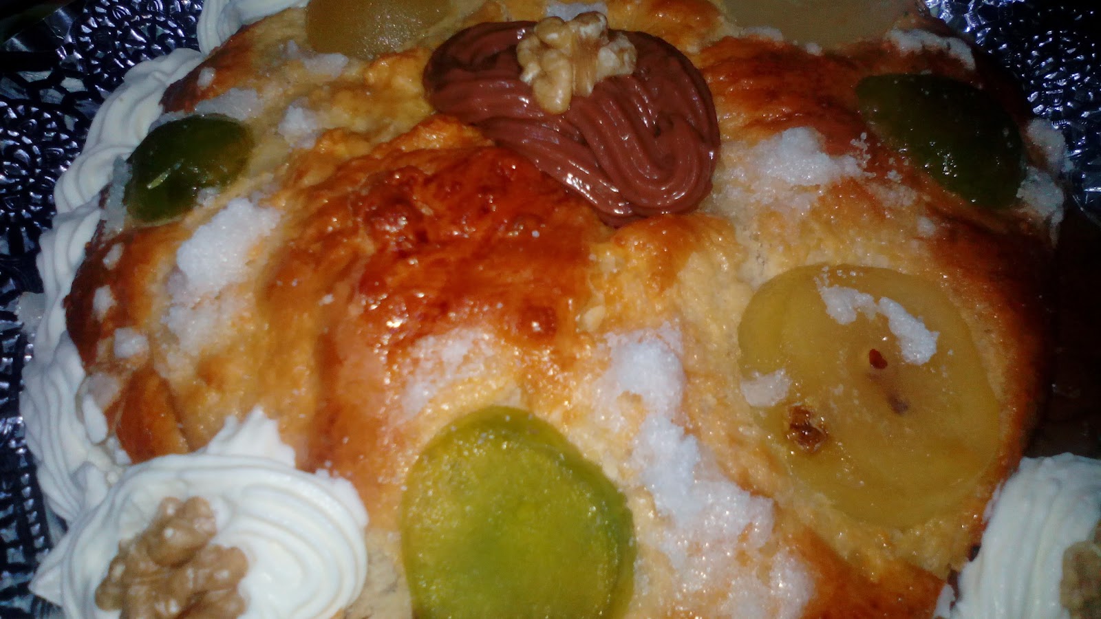 Una vez pasado el tiempo de fermentación,cogeremos nuestro rosco,pincelaremos con huevo para darle brillo y decoraremos,con azúcar por encima, fruta escarchada,frutos secos lo que más os guste.