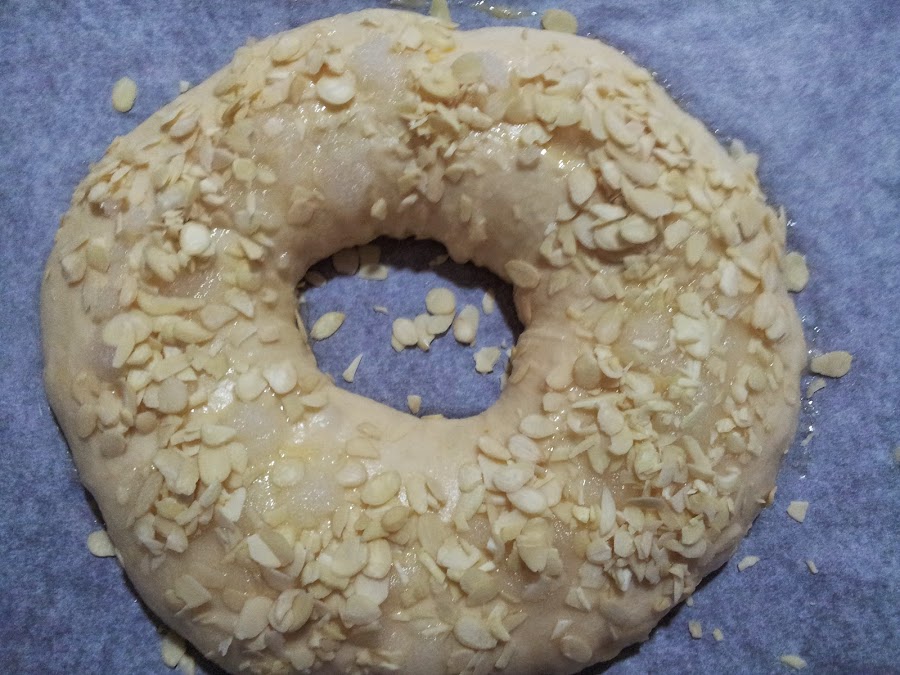 9) Una vez haya fermentado, pincelamos con huevo batido, con cuidado de no pincharlo o se desgasificará y lo decoramos al gusto. En mi caso, con almendra laminada y azúcar humedecido con agua de azahar, aunque lo típico es hacerlo con frutas confitadas, pero en casa no gustan mucho.