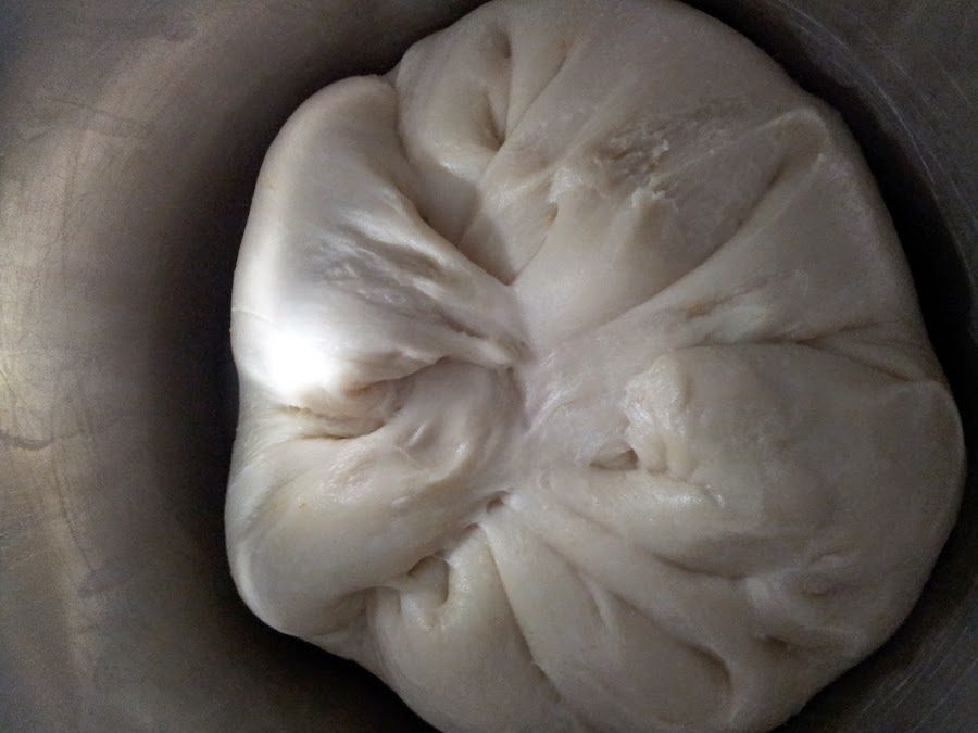 4) Una vez hayamos amasado bien, vamos con el preformado, para ello nos engrasamos las manos con aceite para que no se nos pegue la masa y, si fuera necesario, también engrasaríamos la encimera. Dejamos la masa encima de la encimera y vamos plegando los extremos hacia el centro, hacemos unos 20 plegados, debe quedar lo más redonda posible.