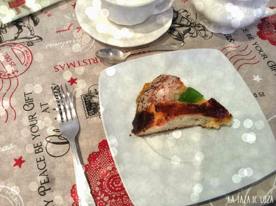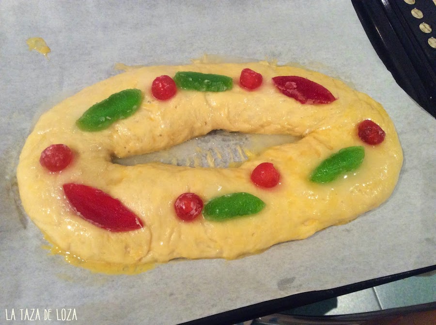 Ya a punto de meterlo en el horno, con el segundo levado a punto. Solo pintarlo con el huevo y ponerle la fruta escarchada por encima y el azúcar "mojado". Las frutas escarchadas las compré en una de las mejores pastelerías de Cádiz, situada en el centro de la ciudad, se llama Maype, en la calle Corneta Soto Guerrero. Elegí unas cerezas, melón rojo y melón verde. Exquisitas. Las tienen todo el año.