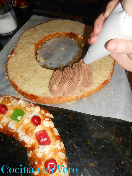 4/ Finalmente lo pasamos a una manga pastelera y vamos rellenando el roscón. Una vez rellenado lo metemos en la nevera para que la trufa quede dura y no decaiga. Cuando veamos que la trufa esté consistente estará listo para servir.