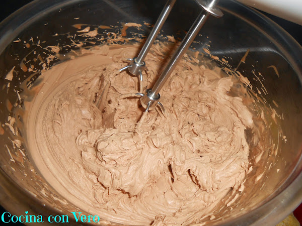 3/ Pasamos la trufa que metimos ayer en la nevera a un bol y con la batidora situando en ella las varillas o bien con la amasadora empezamos a amasarlo hasta que nos quede como la nata montada (crema de leche).