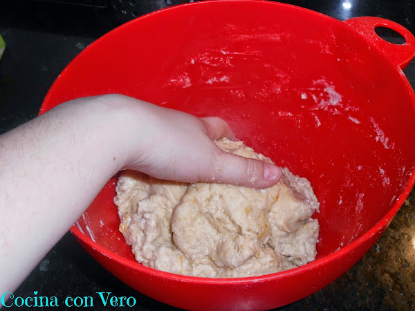 Una vez echo eso se lo vamos incluyendo poco a poco al bol, echando y revolviendo con la amasadora ó bien a mano hasta que nos quede una masa elástica, es decir, que no se nos pegue a las manos. (Si vemos que no quedó bien le añadimos un poquito más de leche templada, muy poco sin pasarnos como unas gotas pequeñas de más.