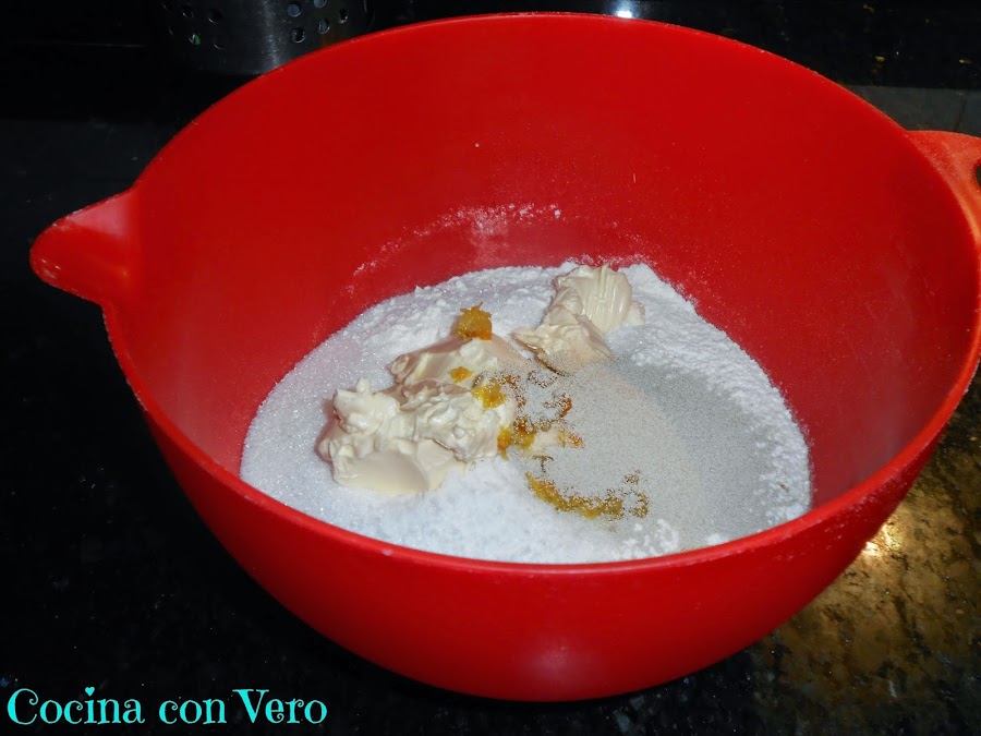 1/ En un bol echamos la harina, el azúcar, la sal, la mantequilla, las dos ralladuras y la levadura.