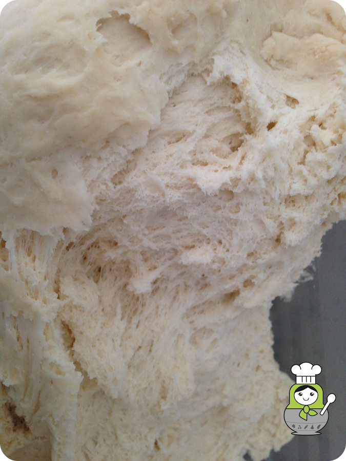 Vamos incorporando la leche y amasando hasta que se forme una bola. Dejamos reposar unos 10 minutos y luego amasamos durante 5 minutos hasta obtener una masa lisa (aunque estará algo pegajosa). Añadimos la mantequilla en el medio de la masa cortada en daditos y a temperatura ambiente, que esté bien blandita. Le damos unos movimientos a la masa, lo justo para que se integre la mantequilla, pero sin trabajar mucho la masa. Dejamos reposar durante un par de minutos y luego amasamos unos 10 minutos. Este es el amasado más importante, pues como indican en el libro es el que dará esponjosidad al roscón.