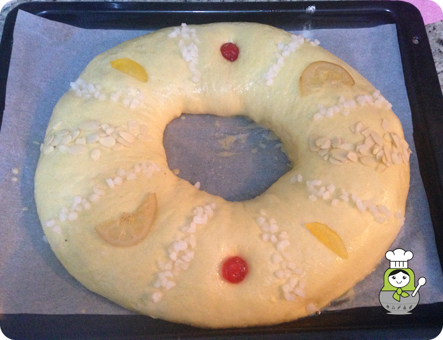 Nuestro roscón ha vuelto a doblar su volumen. Ahora solo queda volver a bañarlo con huevo batido, decorarlo con las frutas confitadas, el azúcar y la almendra al gusto y cocerlo en el horno precalentado a 180º durante 25 minutos (dependiendo del tamaño).