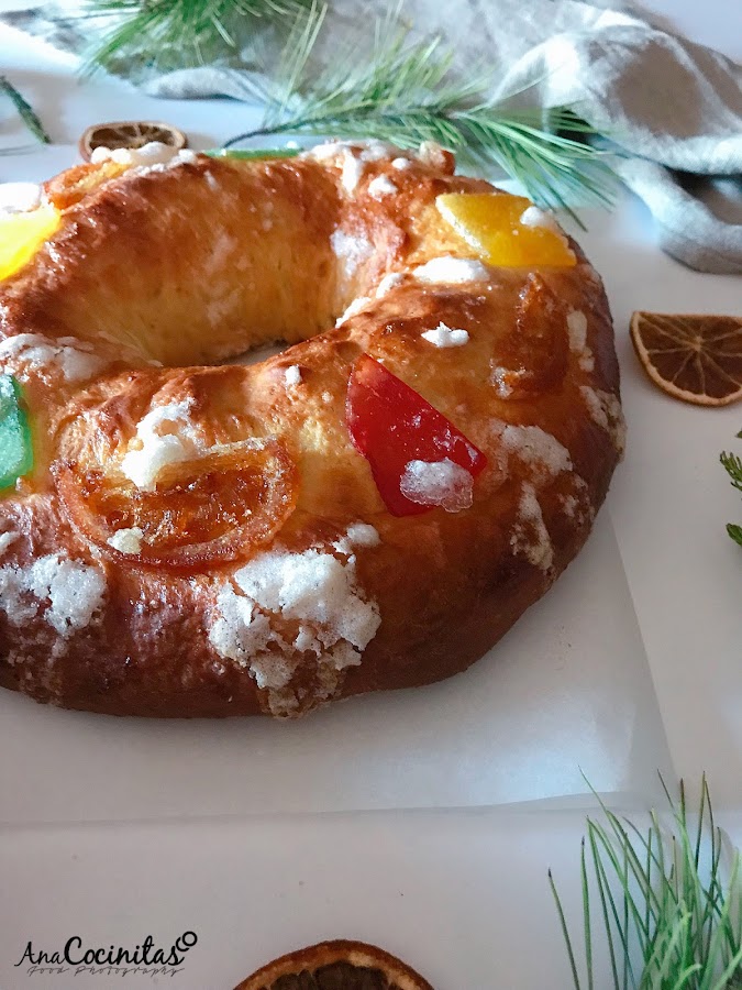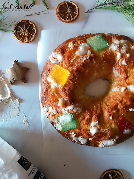 7. Una vez haya pasado ese tiempo pintamos con huevo los roscones y solo nos queda decorar al gusto con fruta escarchada, con azúcar escarchado (mezclar un pelin de agua con azúcar), con almendras laminadas, etc... y añadir si queremos la figura y la haba (opcional)