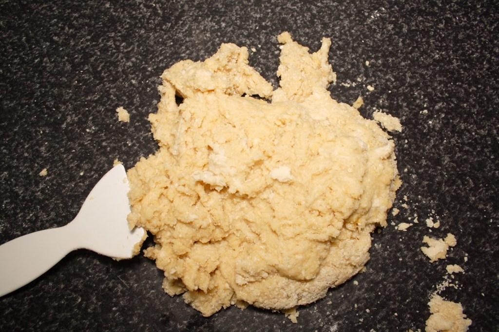 Cuando no podáis amasar en el bol, volcáis todo en la encimera y seguís amasando de forma que la masa se suelte de las manos y no se pegue en la encimera.