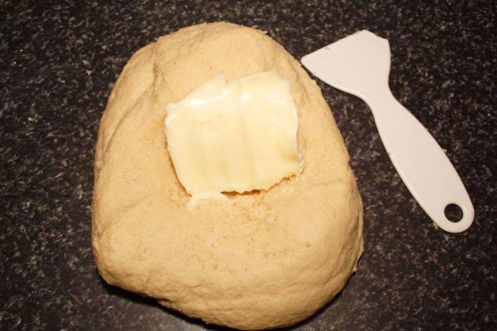 Llegados a este punto añadimos la mantequilla, seguimos amasando. Al principio se nos quedará pegada la masa en las manos y en la encimera pero no os preocupéis, seguimos amasando, la mantequilla se va integrando en la masa y ya no se pega.