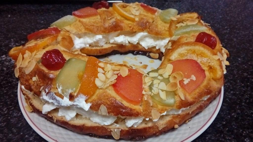 He hecho el roscón de reyes como mandan los cánones: con sus frutas escarchadas y relleno de nata (crema de leche). Lo he repetido en más ocasiones, pero como no era tiempo de frutas escarchadas, las he sustituido por frutos secos.