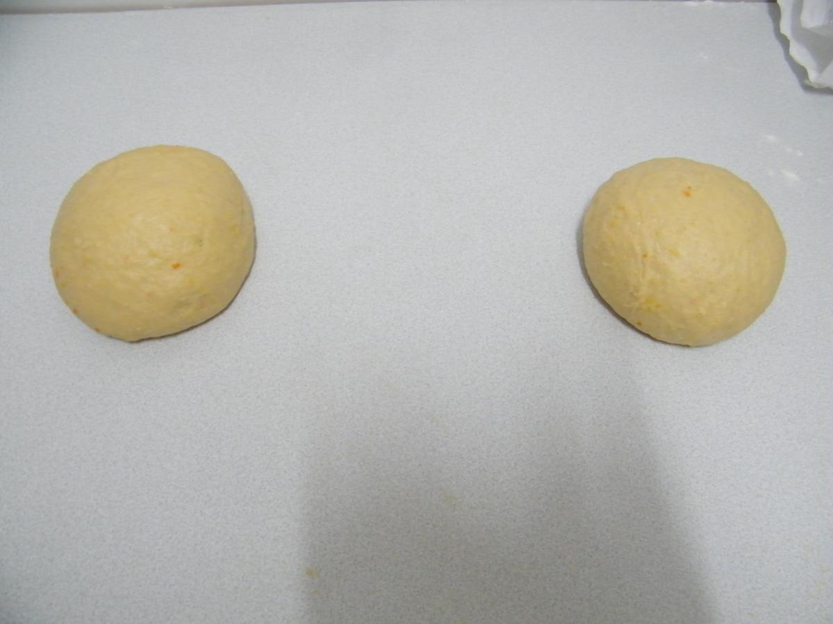 Dividimos la masa principal en dos, las boleamos dejándolas redondas y firmes y dejamos que reposen unos 5 minutos. Este reposo relajará la masa, y es importante y necesario después de haberla amasado.