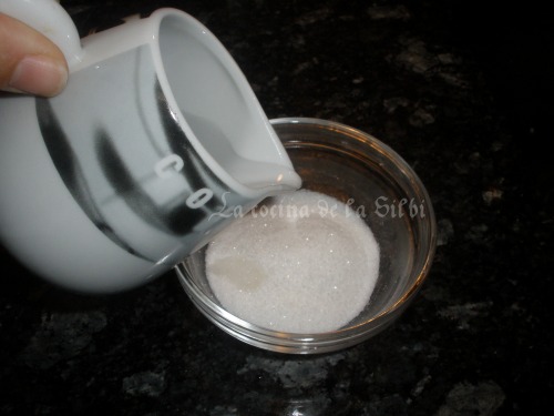 Para hacer el azucar para decorar, ponemos en un bol un poco de azucar y lo humedecemos con unas gotitas de agua, lo removemos un poco y disponemos encima del rosco ya pintado. Una vez horneado el rosco este azucar se queda duro formando una especie de costra.