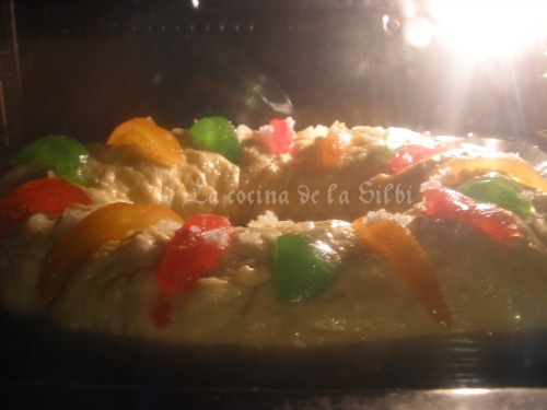Le ponemos las tiras de frutas por encima intercalando los colores para que que quede más bonito. Y aqui es donde podeis meter el haba y los muñequitos en un trozo de papel de albal e introducir en el rosco, yo no lo hice porque lo haré en el que haga el mismo día de reyes, y lo introduciré dentro de la nata (crema de leche) del rellleno