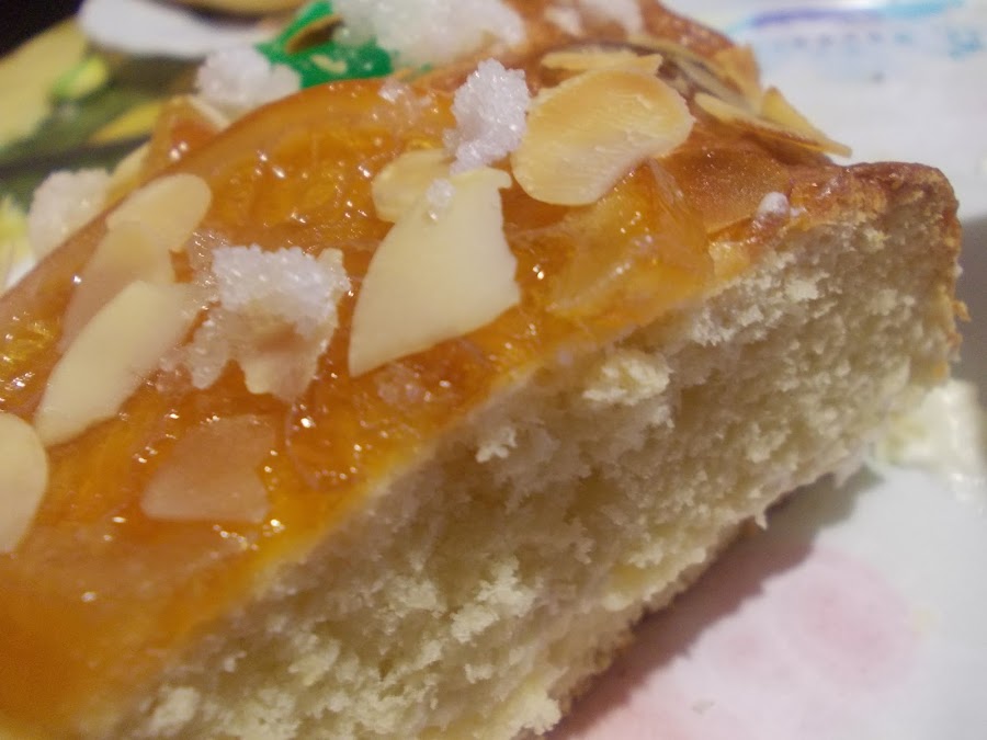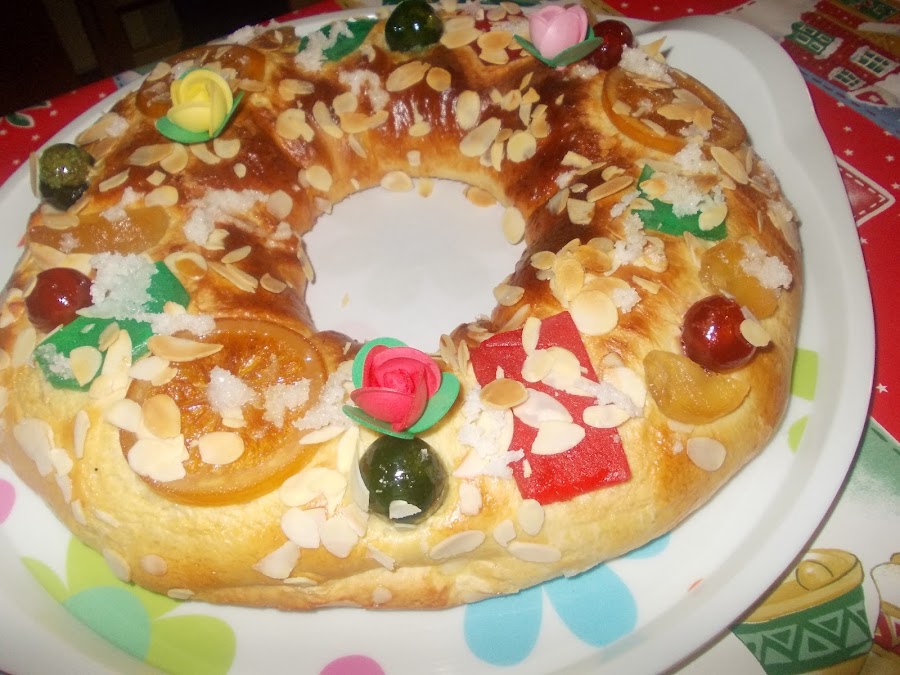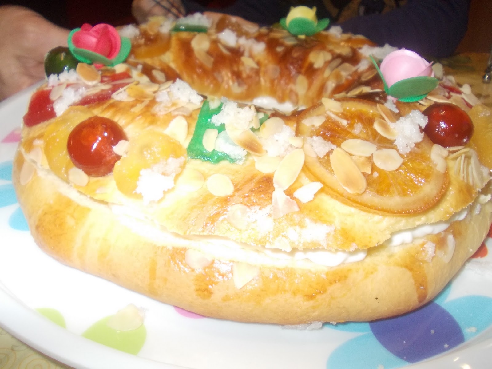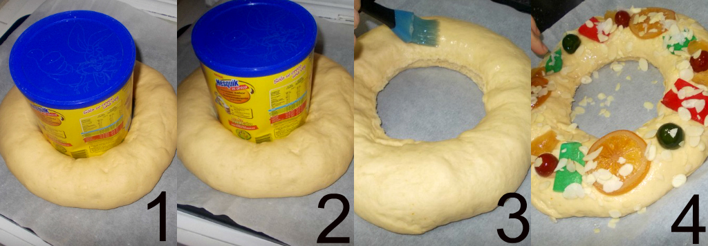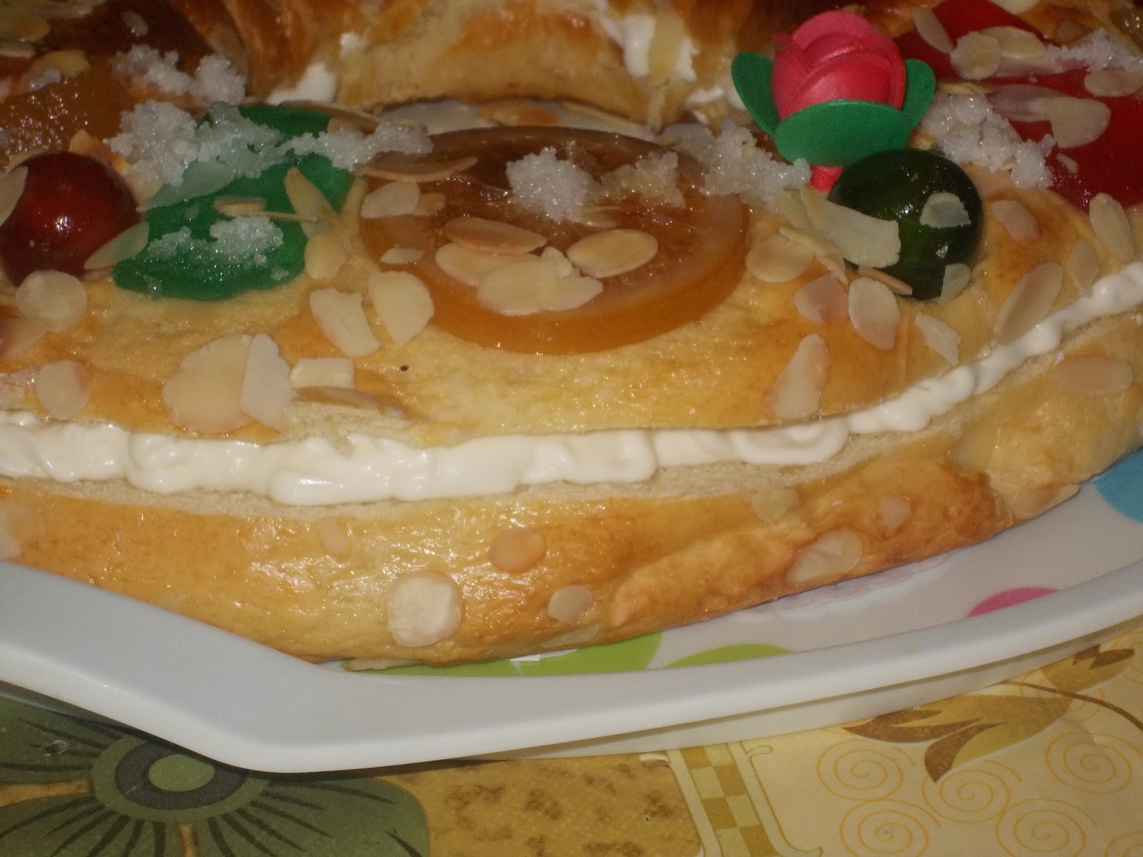 Todos los ingredientes deben estar a temperatura ambiente. Ponemos la harina en un recipiente y hacemos un agujero en medio, donde añadimos el azúcar y lo mezclamos bien. Disolvemos la levadura fresca en medio vaso de leche tibia, (no caliente porque se estropea la levadura), y lo mezclamos con la harina y el azúcar despacio con una cuchara. Añadimos el anís, las ralladuras, la mantequilla fundida, y mezclamos otro poco. Añadimos ahora un huevo y una pizca de sal. A partir de aquí amasamos hasta que la masa no se nos pegue a las manos, y si es necesario poner algo más de harina, aunque con cuidado porque no se quede luego dura, ir mirando de poner poquita. El amasado debe durar al menos 15 minutos. Una vez hecha la masa, hacemos una bola y un agujero en medio, entonces le vamos dando la forma de roscón, la ponemos en la bandeja del horno sobre el papel de horno, y la haba y el rey lo envolvemos en papel film y por debajo, los escondemos en la masa. Yo puse un bote grande de Nesquik para que cuando fermente la masa no se cerrara el agujero. El proceso de fermentado duró 4 horas, triplicó su volumen. Entonces quitamos el bote de nesquik y pintamos todo el roscón con un huevo bien batido, y con cuidado decoramos el roscón con las frutas escarchadas y la almendra y el azúcar.