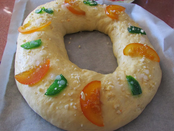 Lo pintamos con huevo batido y lo adornamos con frutas escarchadas, almendras picadas o laminadas y azúcar humedecido.