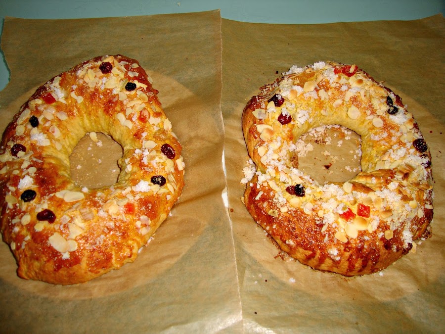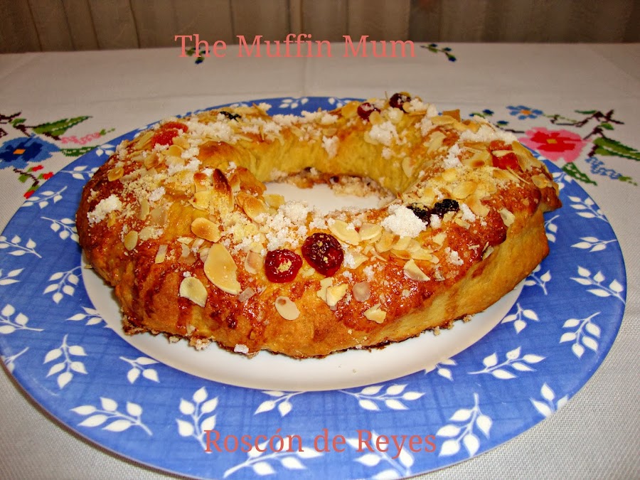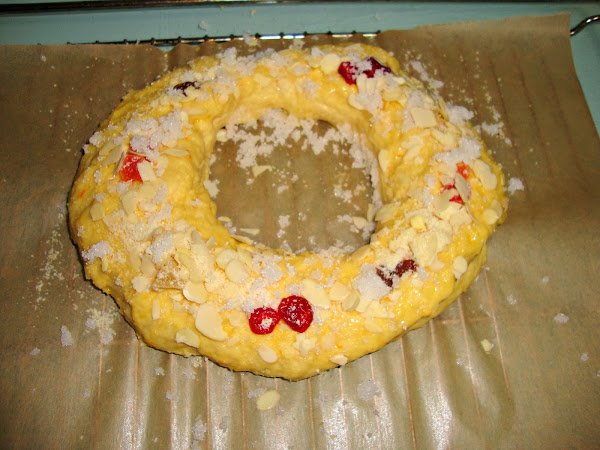 Para decorarlo pintamos el roscón con huevo batido y luego decoramos al gusto, yo he usado azúcar húmeda, almendra fileteada y cerezas, mango y papaya desecados y metemos en el horno a 180º C durante unos 18-20 minutos.