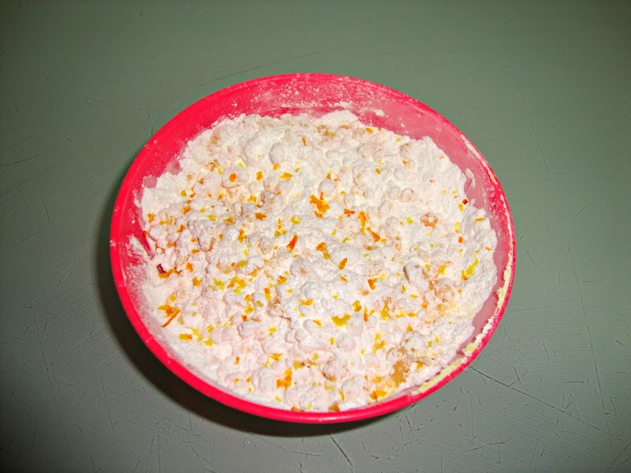 Para hacer el azúcar aromatizado simplemente echamos la ralladura de medio limón y media naranja en el azúcar glass y lo dejamos que repose para que coja todo el aroma.