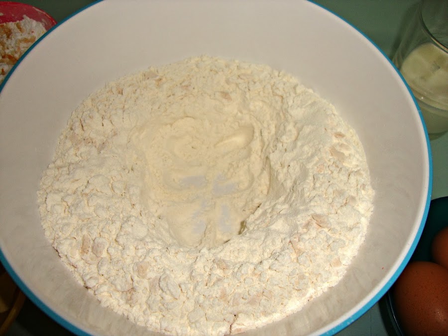 En un bol deshacemos la levadura fresca sobre la harina y hacemos un hueco en el centro para ir añadiendo los demás ingredientes.