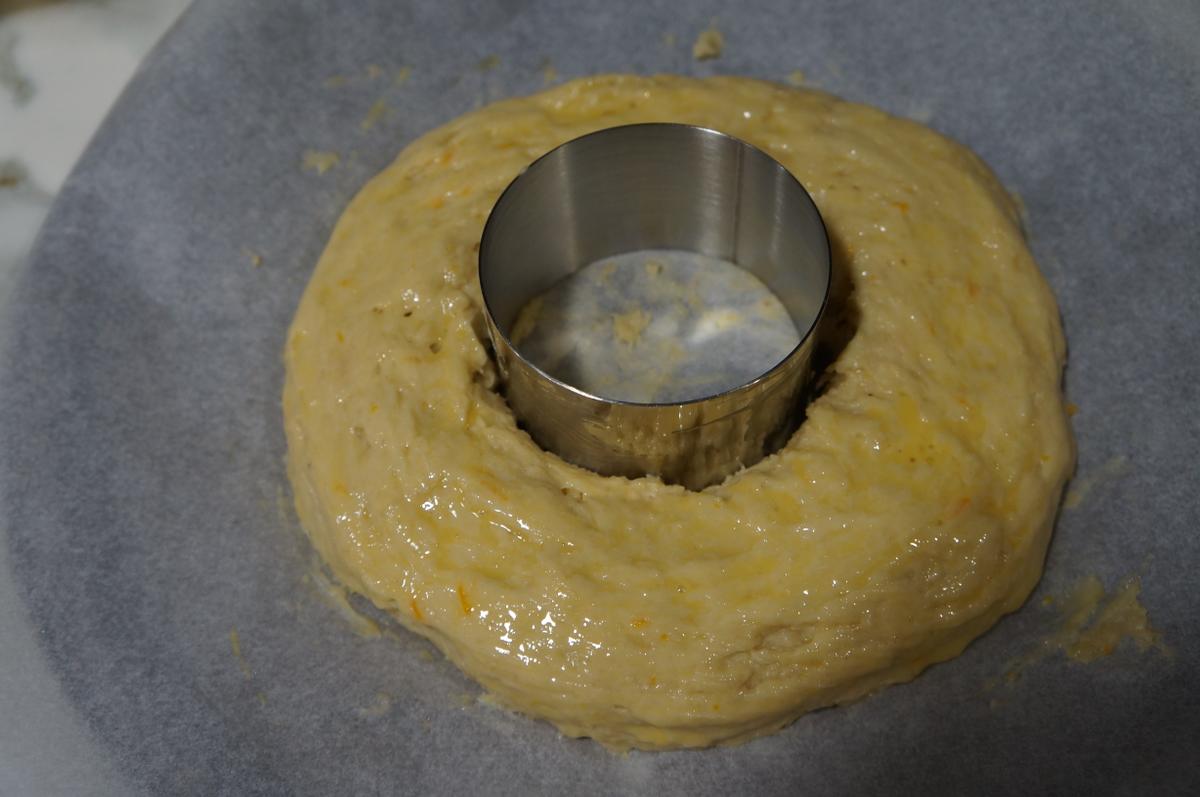 Forma el roscón mientras se precalienta el horno. Pasa la masa a una bandeja de horno forrada con papel vegetal. Dale forma con ayuda de una espátula. Coloca algo circular en el centro para que no se cierre el círculo. Pinta con huevo batido y hornea 20-25 minutos, hasta que veas el exterior dorado y completamente cocinado.