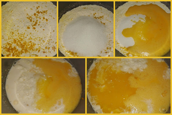 Batimos los huevos y los agregamos al bol, junto con la ralladura de limón y de naranja, el azúcar, la levadura disuelta en la leche, el zumo de naranja y la esencia de anís.
